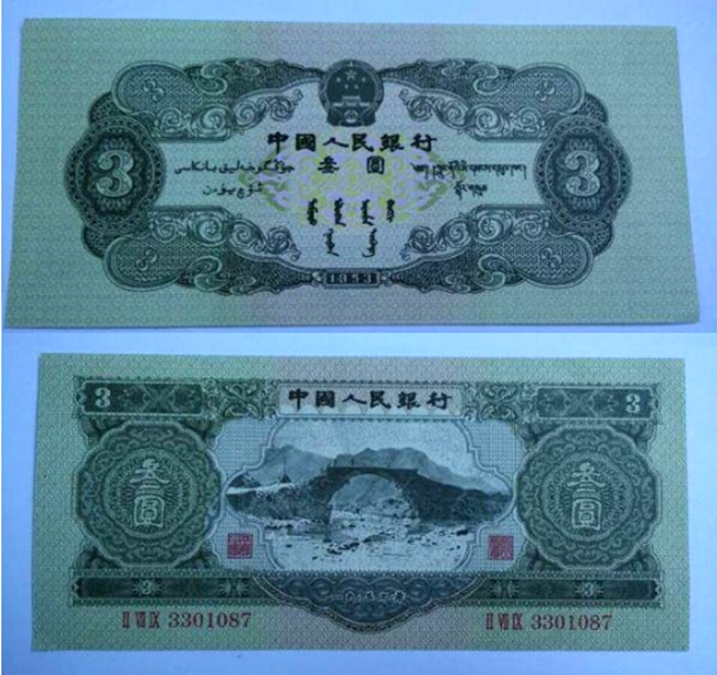 据了解,三元人民币是第二套人民币中的罕见币种,整体呈淡绿色,是我国唯一一张面额为三元的人民币纸币。纸币下方标着“1953年”,正上方为“中国人民银行”字样,中间是井冈山龙源口石桥图景,于1955年3月1日发行、1964年5月15日停止收兑和流通并回收,目前存世量极少。