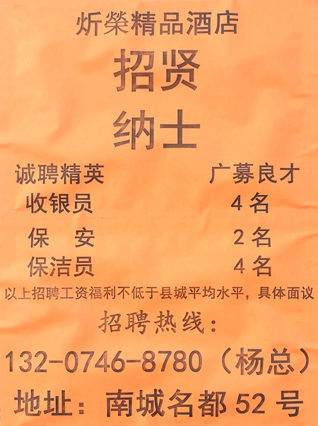 炘榮精品酒店诚聘收银 保安 保洁