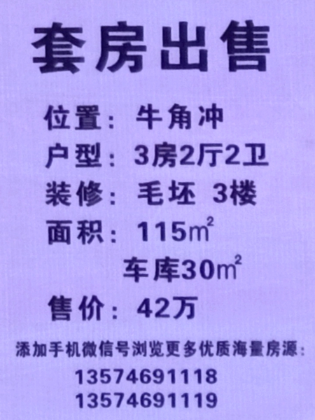 >> 牛角冲3楼毛坯房出售 42万元