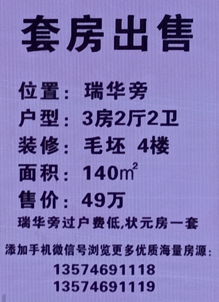瑞华学校旁毛坯房出售 49万元