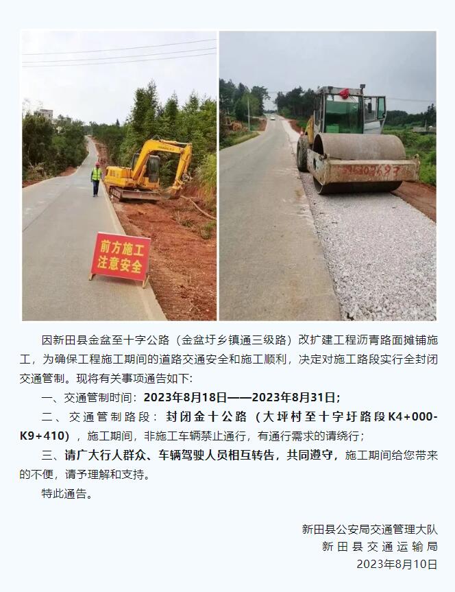 8月18日起,金十公路全封闭施工,车辆请绕行