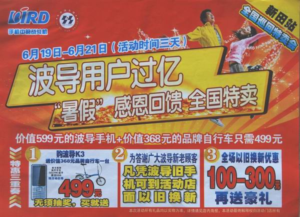 一、活动价格499元购波导K3手机(原价599元),送价值368元品牌自行车一台,无须抽奖,即买即送。